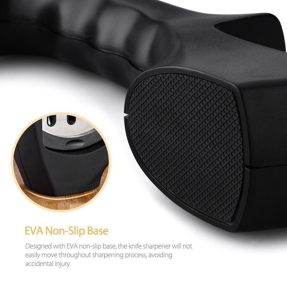 • SAFE AND DURABLE. The 5″ ABS plastic handle keeps your hands safely away from the blade. Non-slip rubber base helps to firmly attached the sharpener to the tabletop.
