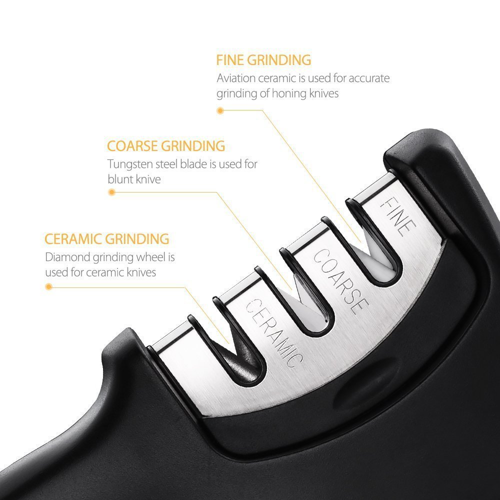 • 3 CONVENIENT KNIFE SHARPENERS in One Simple Unit. Easily sharpen a variety of knives using one simple unit.
