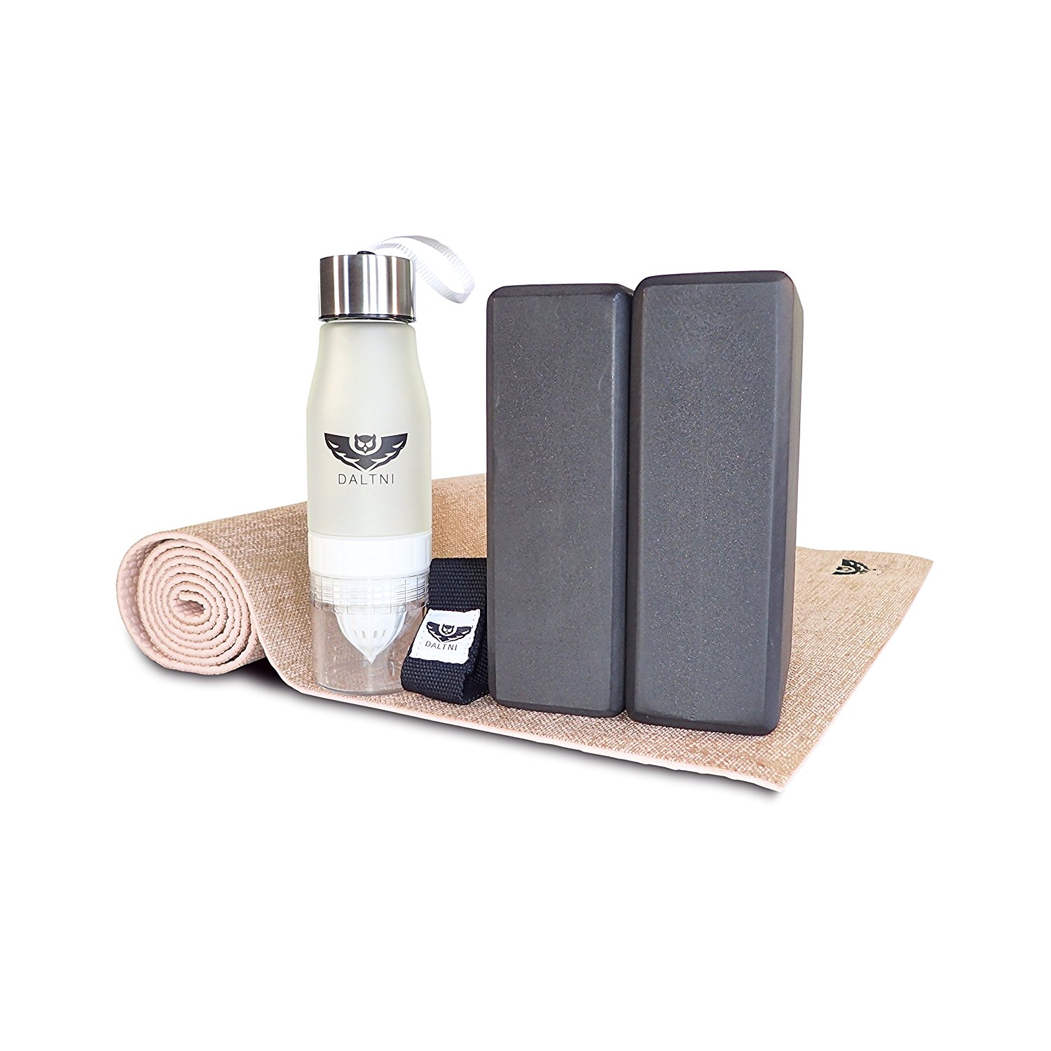 This complete DALTNI yoga bundle is exactly what you will need to show up to class ready to get to work. The bundle includes a beautiful yet durable jute and PVC yoga mat. Woven with jute fibers, this mat is more resistant to stretching and warping over time. The back of the mat is also non-slip, helping to make sure your yoga mat gives you the stability you need. EVA foam yoga blocks are also included in the bundle. The yoga blocks are made of soft yet firm EVA foam. Foam yoga bricks are ideal for fitness enthusiasts who dislike the stiffness of cork yoga blocks. The included yoga sling can also be used as a stretching strap. Allowing you to practice poses that would normally need assistance. The DALTNI yoga strap is a lightweight and portable yoga accessory that doesnt add unnecessary bulk – easily toss it into your yoga bag, backpack, or purse so you can take it with you to the gym, yoga class, fitness center, and anywhere you go to stay fit. And unique to the DALTNI yoga bundle only, youll also get an infuser water bottle. Use the infuser basket for fruits, veggies, herbs, tea, and so much more. The possibilities are only limited by your creativity. Have fun making your own natural detox beverage and start feeling better day after day. Specifications: Yoga Mat: Size – Standard, 72 inches long, 24 inches wide. (72 x 24) Thickness: 6mm. Material Jute and PVC. Yoga Blocks: Size – Standard, 9″L x 6″W x 4″H. Material EVA Foam Yoga Sling: Size Standard. Material – Cotton Infuser Water Bottle: Size – 21oz. Material Safe to drink from, food grade, BPA free plastic with stainless steel top.